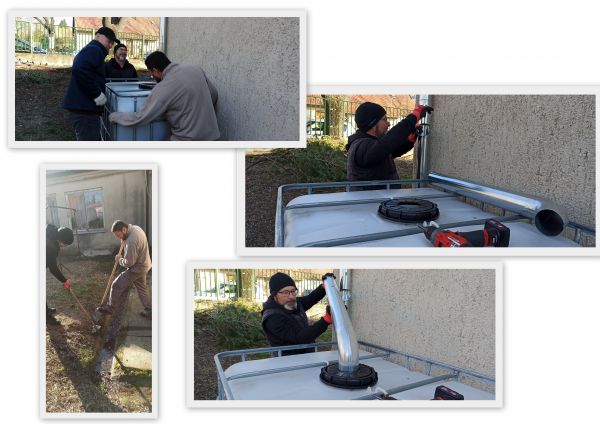 A pályázaton nyert támogatásból 2 db 1000 l-es esővíz gyűjtő tartályt sikerült vásárolnunk mellyeket az udvaros bácsi és néhány szülő beépített az ereszcsatorna alá.